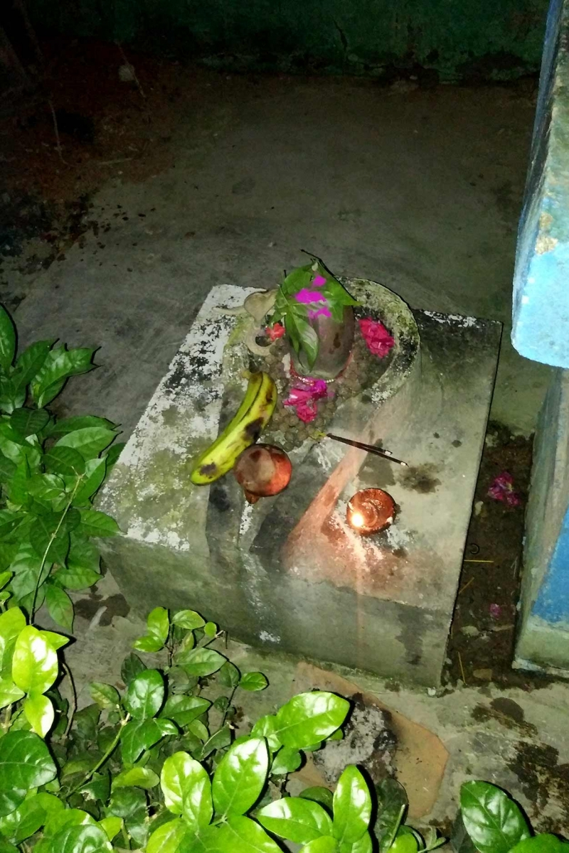 Once the thali was prepared, she worshipped the Shivlinga kept alongside the Tulsi plant in the open courtyard of the house. Later, prayers were also made to other deities in the house, including ancestral deities. It is interesting to note, while the puja thali for Shivalinga contains marijuana, it is removed when prayers are made to other deities, particularly feminine.
