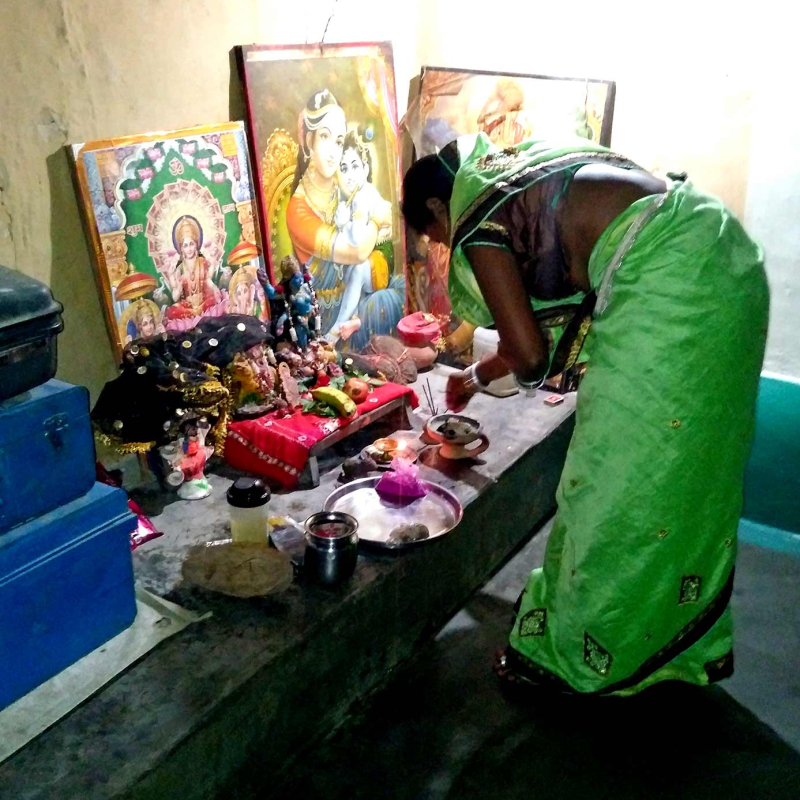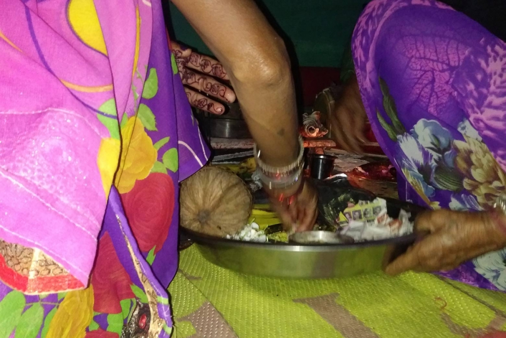As the evening falls, women prepare for puja in their houses. For instance, Balita Netam (a Gond woman), from Bajarkurdih, married in Palwadi came to her mother’s house to celebrate Teeja with her friends and other women of the village.