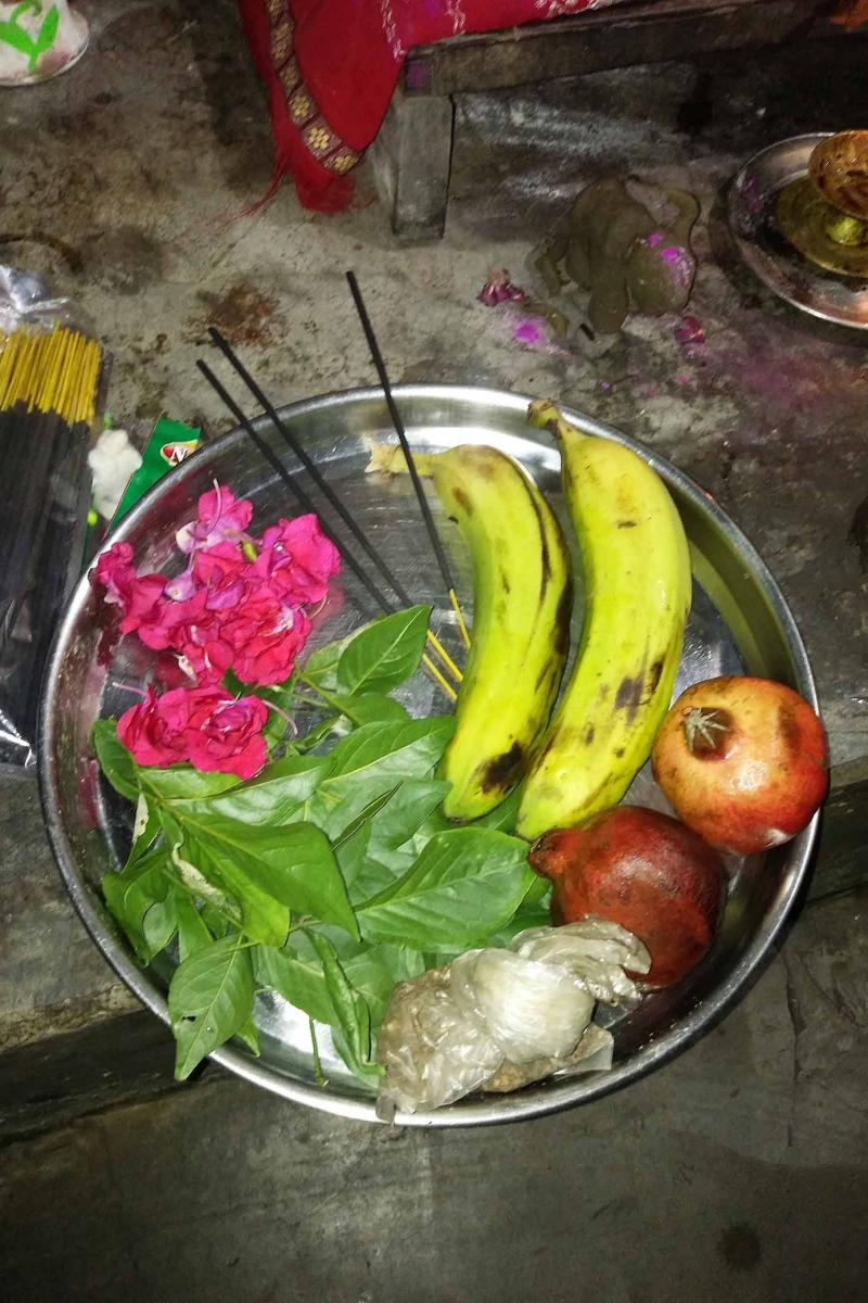 Figure 2: Prepared Teeja Thaali with Flowers, Fruits, Bel Patra, Incense Sticks and Marijuana