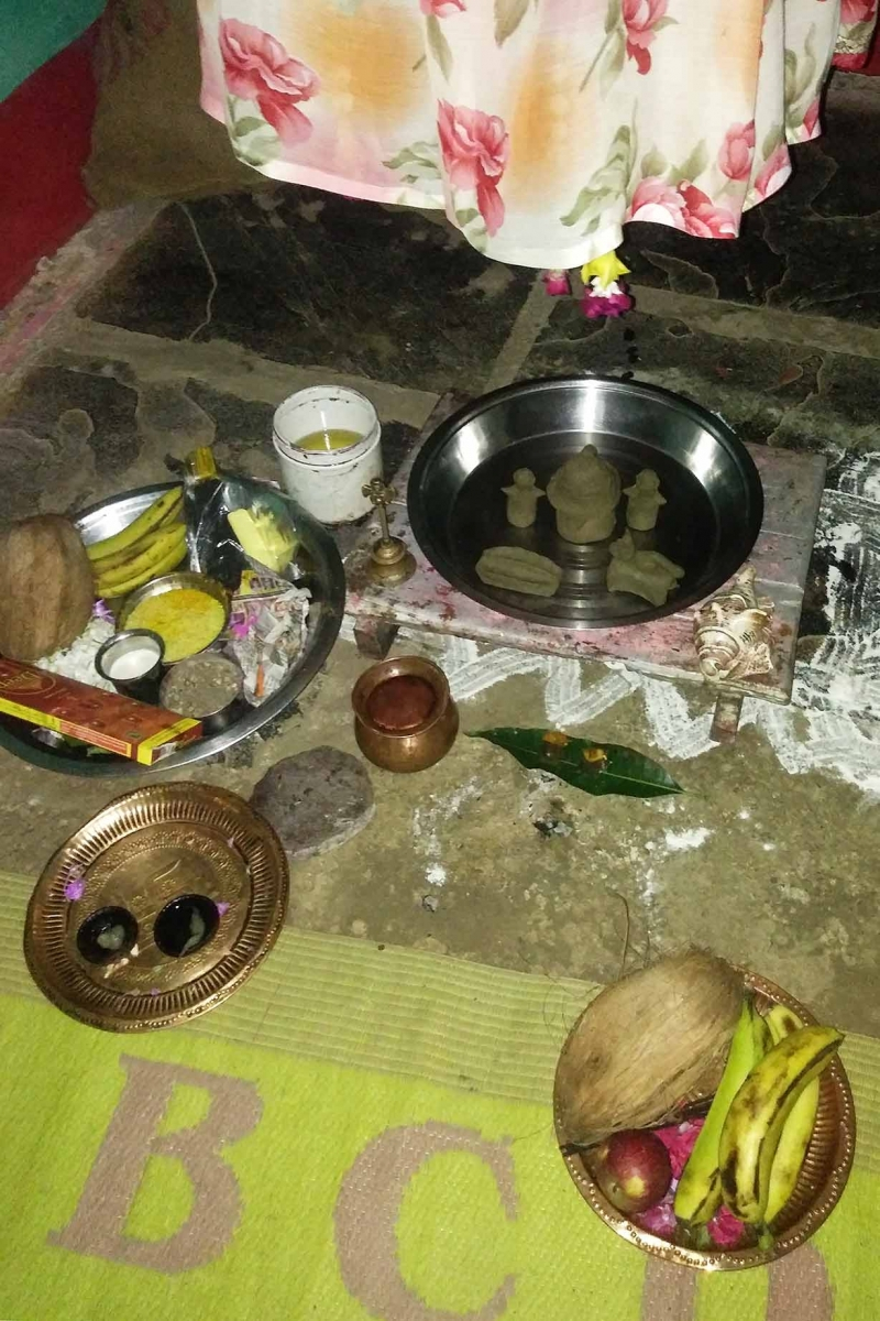 The assortment of things gathered for Teeja puja by Balita and her friends included small forms of deities made in mud and clay. These included small figures of Ganesha, Shiva, Parvati and Nandi (the bull). The thali also had one other small structure, which looked like a plank. A few women offering puja explained that it was a boat. However, no one present in the ritual was sure what these figures signified and why they were kept in the thali, alongside other figures. Other things included, dry coconut, shankh, rice mixed with turmeric, flowers, fruits, kalash and diyas.