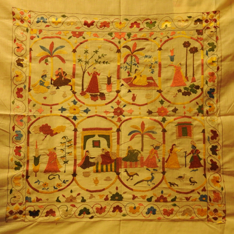 Because of its name, Chamba rumal is often confused for a literal handkerchief, but it refers to the art form of Chamba embroidery, which involves various stitching styles, techniques, images and most importantly, stories. Chamba rumal extends across various artworks like double-sided frames, handkerchiefs, covers, belts, sheets, shawls, dupattas, fans, and more. The embroidery is intertextual as literature and paintings are reinterpreted and one cannot distinguish paintings, stories and embroidery from one other when woven as one in the final creation.