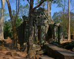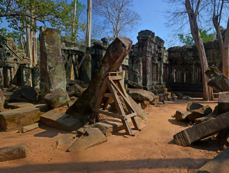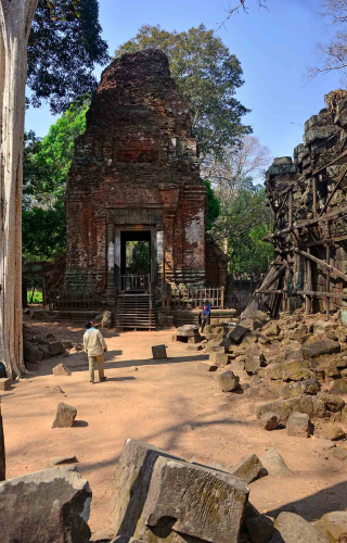 In the 1970s, Cambodia plunged into a civil war unleashed by the ultra-left Khmer Rouge regime. After the war ended, Koh Ker was painstakingly de-mined and more than 180 monuments identified. In comparison to temples at Angkor, little restoration has happened at Koh Ker. Many ruined monuments are on the verge of collapse; some are supported by wooden frames while others are tied up with wire. Although the site has been pillaged of all standing artwork, it continues to be targeted by gangs of thieves.