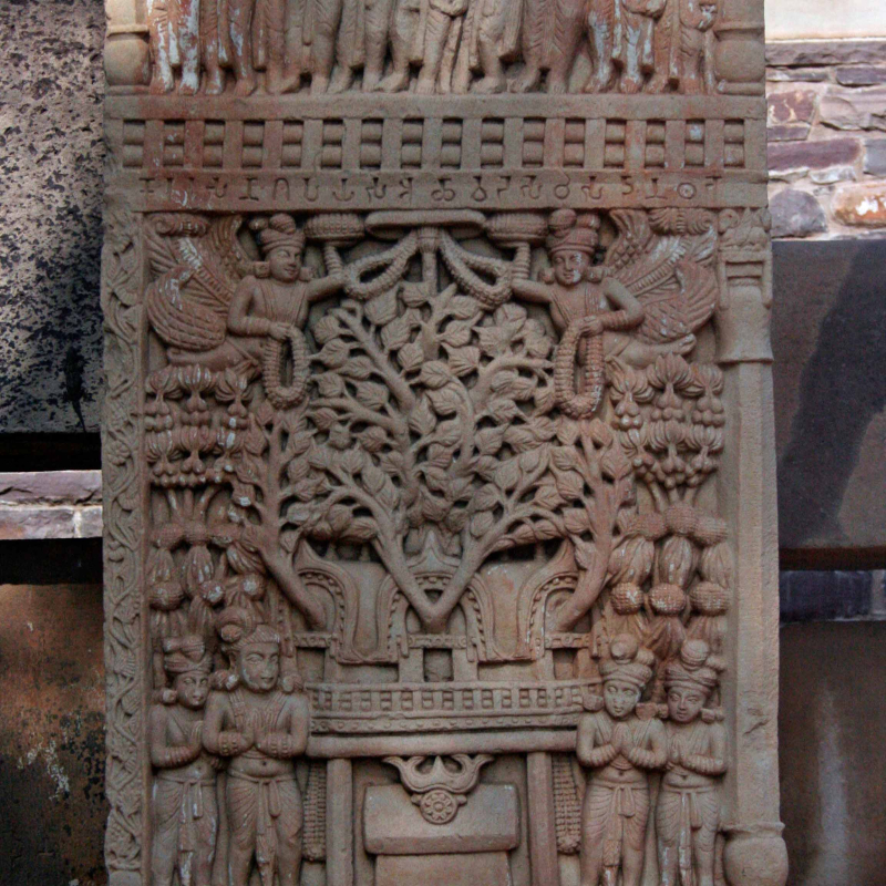 Banner Image: Sculpture of the Bodhi Tree, meditating under which Gautama Buddha said to have obtained Enlightenment, from the stupa at Sanchi (east face of the south pillar, east gateway of Stupa 1). The Buddha is represented by the canopy under the Bodhi Tree, in keeping with the conventions of this period of Buddhist art.