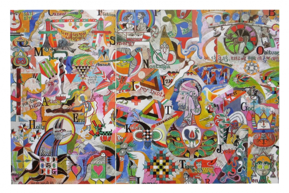 Another work, 'A-B Zee of My India' (1999) is in mixed media, using acrylic and pen-and-ink work on paper. In this particular work the written text is not only in Gujarati but also Hindi and English.