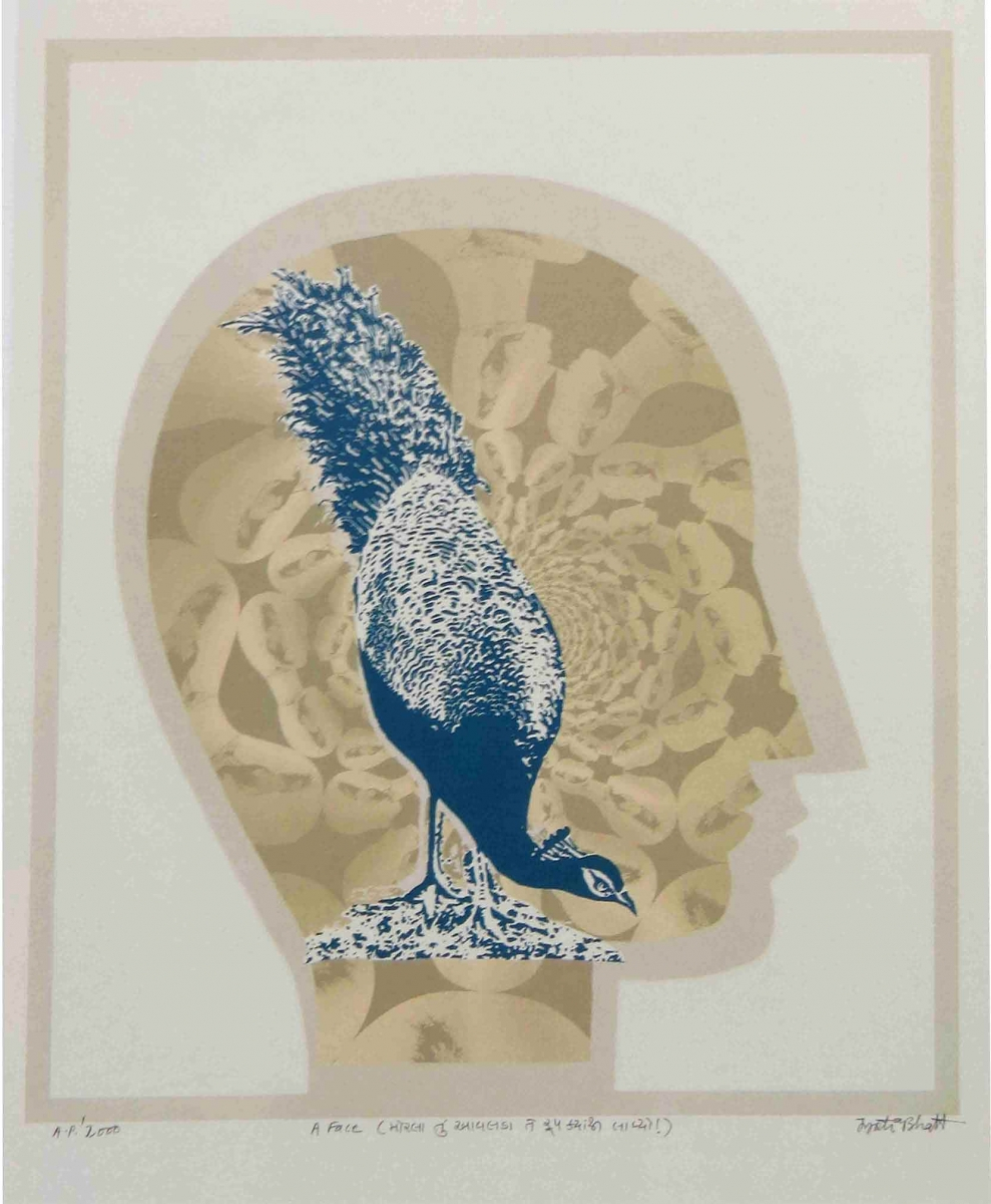 In two prints with the title, 'A Face' (one done in 1972, the other in 2000), Jyoti Bhatt’s symbolic representation of the human head composed with, or into which a photographic peacock has been incorporated, is a portrayal of his experiences in foreign countries such as Italy, the USA, France and Great Britain where he travelled in his early career for academic advancement. The prints show how the quest for identity and the struggle in an alien country becomes his autobiographical statement in various contexts in works of the next 40 years as a metaphor of our contemporary human condition. He also uses the same face in many of his works, singularly or in multiples, sometimes confronting each other in puzzle boxes, or turning away towards the frame.