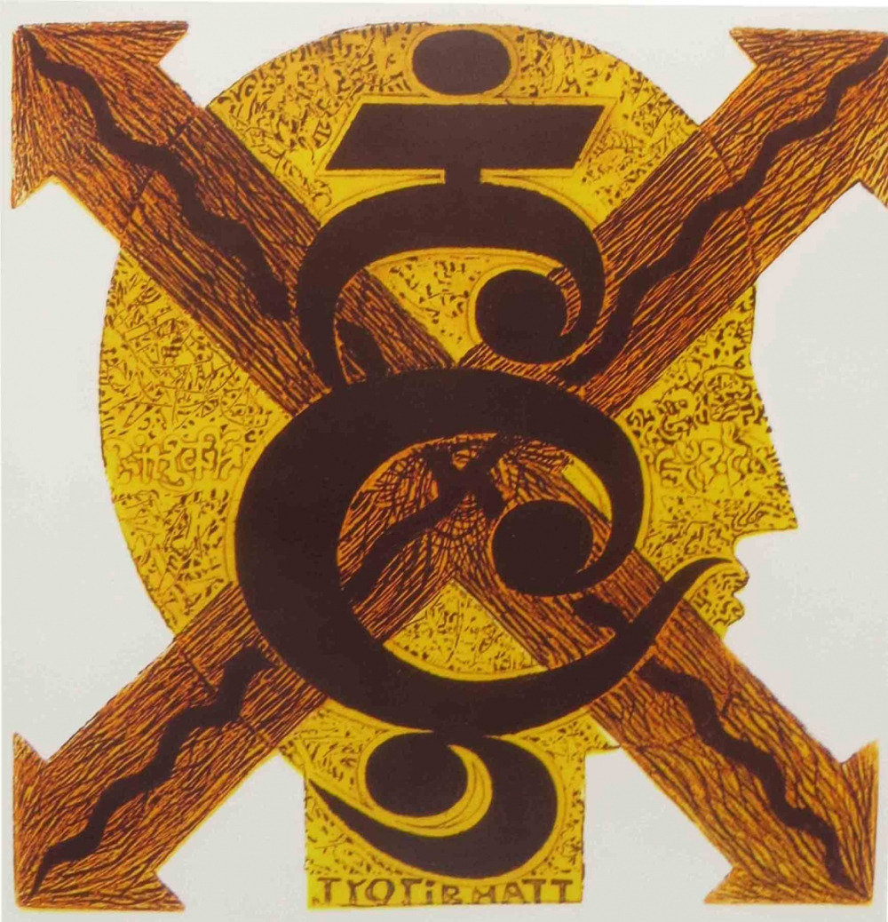 In many of his works, one can see inscribed visuals with or without images in a very ornate and stylized manner. One instance of such a work of Bhatt is titled, 'A Face', a mixed intaglio print from 1968, where the Gujarati word ‘Hun’ (meaning ‘I’ in English) is inscribed in an attractive manner on the outlined human face, over which arrows in all four directions form a cross, as if defining the word ‘Hun’ very aptly. The addition of this inscription in this work causes the impact of the message to be very sharp and direct.