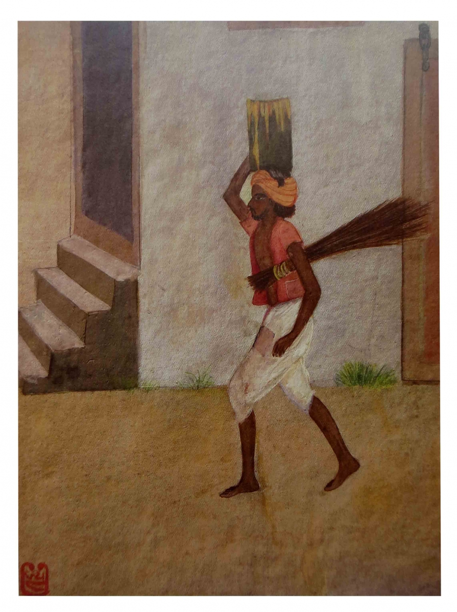 His earliest work, Chheta R’ejo Maa Baap ('Please Keep Distance, Sir!', or, literally, 'Keep Away, Mother and Father'), which he created at the age of 12 during his days at the Gharshala centre portrayed a Dalit, the caste with whom contact was traditionally seen as polluting, because it was responsible for manual scavenging. The man is shown walking on the road, carrying the container of waste on his head and a broom under his arms. Bhatt here articulates the fact that members of communities belonging to the caste of untouchables when passing on the street were supposed to say loudly 'Chheta R’ejo Mai Baap' as a warning to the upper caste community to avoid any physical contact or even contact with their shadow. Jyoti Bhatt’s utilization of vocabulary in the simplest form expresses several scenarios—easily interpreted but capable of leaving a lasting impression on the mind of the viewer.