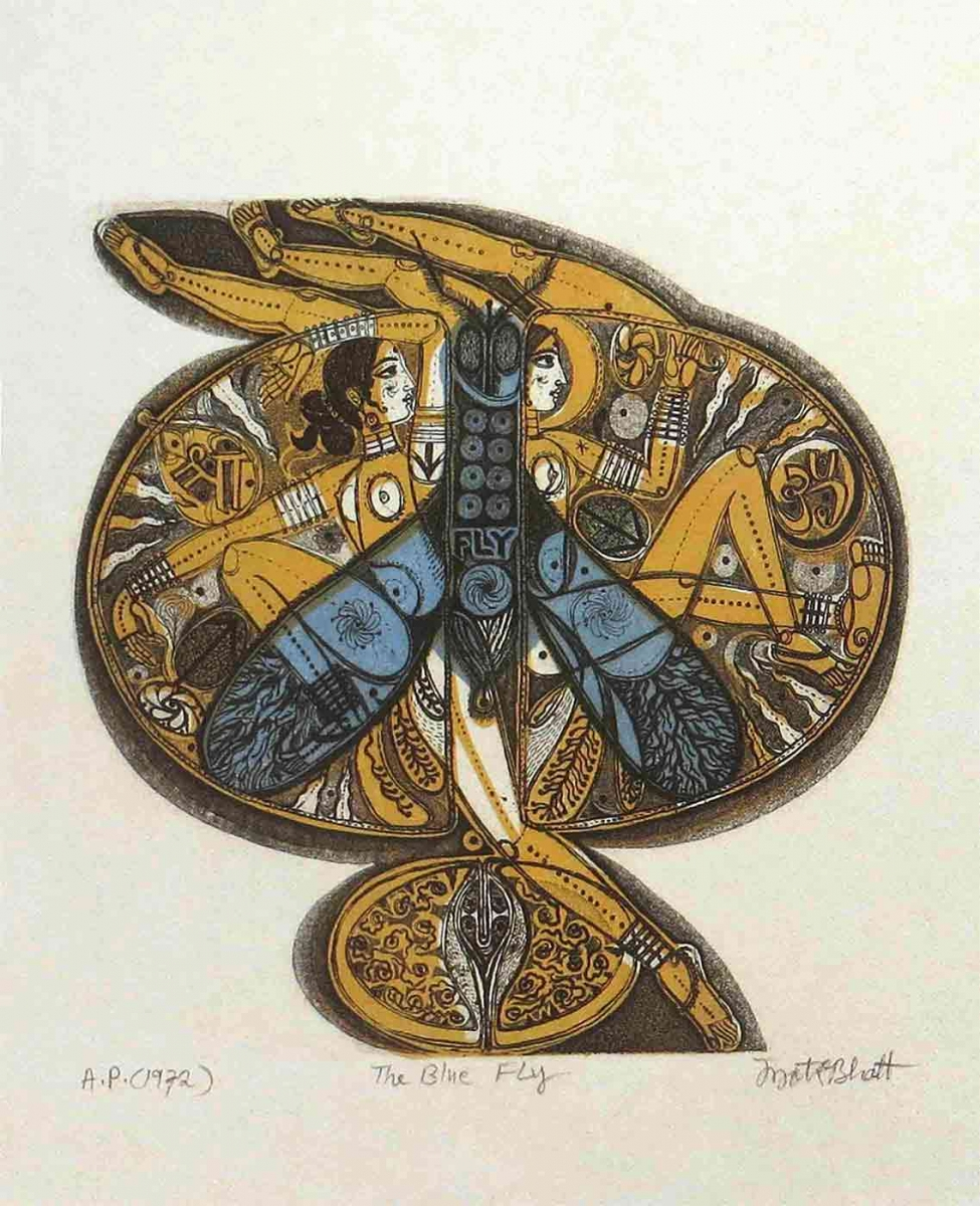 This stenciled expression can be seen in Bhatt’s work entitled, 'The Blue Fly' (1972). In this mixed intaglio print, there are written texts, copulating couples, child-birthing postures and other erotic forms in the background, and the blue fly is stenciled on top of those images and other filler images in dual monochromatic colour scheme. The balanced division of the figures, colour scheme, use of text and other forms and patterns along with the overall shape of the composition gives a touch of finesse and vibrancy to his entire opus.