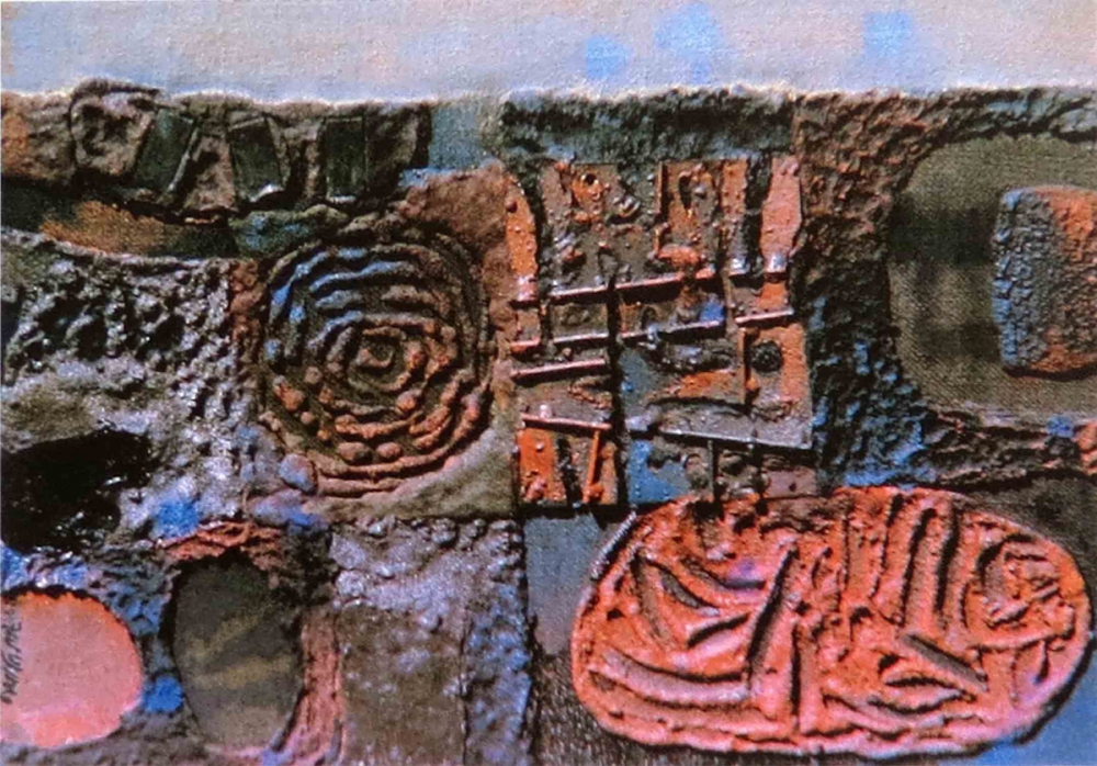 Jyoti Bhatt received a scholarship to study at the Accademia Di Belle Arti, Naples, Italy, in 1961–62. Though he was not enrolled for any particular course through this scholarship, he kept exploring the atmosphere in post-World War II Italy, especially Naples. Bhatt observed and developed a liking for Spanish artist Antonio Tapies and Italian artist Alberto Burri. Both these artists applied heavy textural layers through the thick application of paint on canvas or a mount board in their works, which mainly were abstract paintings using various materials. Their inspiration perhaps was their ambience and situation—the aftermath of World War 2, when damage to property was evident everywhere in the vicinity. The city was still in ruins and this probably influenced the artists. Their style of work focuses on a thickened painting surface rather than on the forms and motifs. The works which Jyoti Bhatt created in Naples, shows the direct influence of these two artists. There is a clear paradigm shift towards depicting landscapes with very simple compositions, and magnified illustrations of monuments, forts, deserts and seascapes. It was during this period that Bhatt started to experiment with various media, using non–art-related materials such as sand, jute cloth, iron pieces, brass sheets, plywood, tapes, stone pebbles, linoleum, texture white, adhesives, etc., on surface of his works.