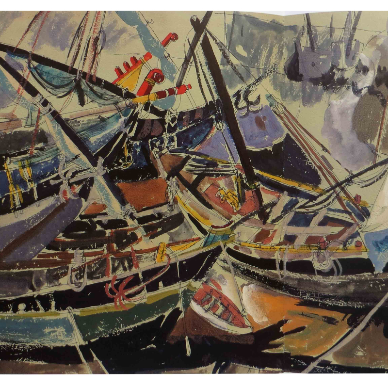 Jyoti Bhatt developed his love for drawing through an interest in birds that had awakened when he used to accompany artist Jagubhai Shah on his outdoor excursions. In these early works, the motif of a bird and its drawings became a medium to communicate with others. He introduced images of birds in most of his paintings, prints and photographs and it formed an integral ingredient of his composition. His work 'In the Garden' (1958) contains line drawings of birds done in a very symbolic manner. Bhatt, especially in this work, utilizes bright colours in hues of red and yellow with overlapping images of birds in various postures. He adds thick and dark lines to render the philosophical manifestation of his primary motif, the bird. In another work entitled 'Birds of Many Feathers' (2002), Bhatt depicts birds in various expressions and stylizations, in which the transparent application of an acrylic colour creates space in a flock and allows us to move around in spite of the crowd.