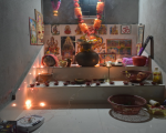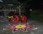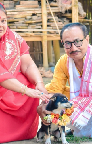 The third day of Tihar Parva, which is the amavasya (new moon) day, is considered to be the most important and is reserved for Goddess Lakshmi’s worship. During the day, people worship cows and, in the evening, they light diyas and decorate their households with light to worship the goddess of wealth, Lakshmi. Once Lakshmi worship is complete, people perform bhoili song and nritya (dance). Generally, the girls perform the bhoili song and dance in honour of Bali, the king of demons. In this way, by performing bhoili song and dance, people enjoy this auspicious night as they forget their worries and pains. The singing and dancing stretches over to the next two days as children make merry while women prepare seal roti (a type of bread). Since the Nepali community in Assam also shares the belief that on the third day of Tihar Parva Lord Ram returned to Ayodhya after defeating Ravana and took charge of his kingdom, people light diyas at night to celebrate his victory and also call Diwali, Deepavali (the festival of lights).