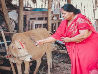 The fourth day of the festival is known as Govardhana puja. On Govardhan puja, people make cow dung hillocks symbolising the Govardhana mountain (mountain of food) and perform various rituals, including the worship of damora(male calf) and bulls.