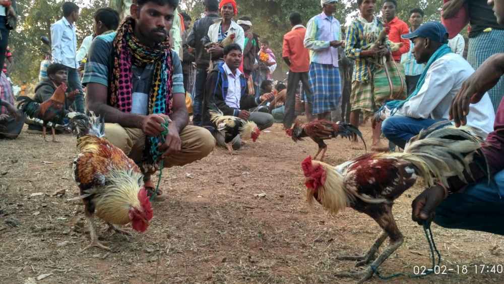 Next to the bazaar, certain spaces too change their nature with the advent of evening. Kukra bazaar or cock fights are organized, and chicken meat sellers and their wives light their earthen hearths to cook meat.