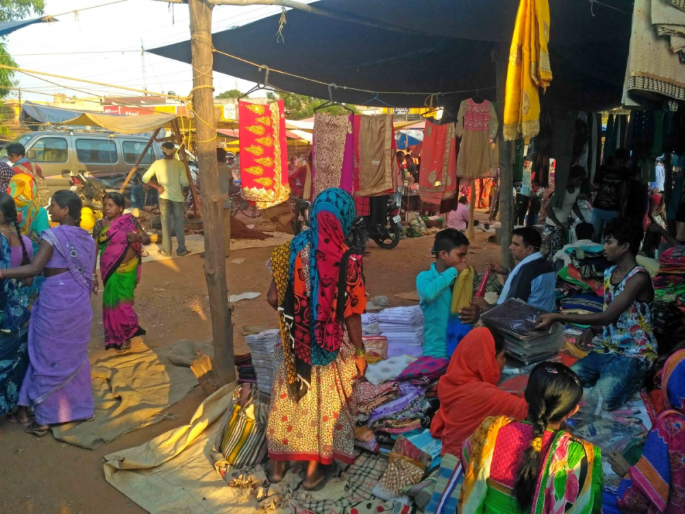 The ritual of the pen karsita, the procession and the parikrama of the chief deity along with the anga, dang and doli of their gods around the fair, literally marks the beginning of the fair in Geedam. Geedam being a bigger town, people from the surrounding villages gather there to sell and exchange their produce. Some sell their home-grown grains, paddy, millets, popped rice, vegetables, handmade baskets, brooms, drums, kakais (combs), while some also sell freshly brewed mahua and sulphi (toddy palm juice). Many forest dwellers bring with them a wide variety of herbs and fruits, such as char, tendu, bhel, behra, and lac, that they gather from the forest,. They sell these to buyers in exchange of money and then buy items of necessity. Most of the townfolk arrange for bigger stalls where they fry savouries such as samosa, kachori and a wide variety of sugar syrup based sweets; many traders from cities come to these fairs with their products and commodities. Silver jewellery and metal pot-makers are a very common sight. Transactions start soon after the ritual procession finishes its ceremonial rounds, and the gods are taken to the deo sthal (sheltered space) for resting. The market picks up pace throughout the day as buyers and sellers stream in; as evening falls, the Madai undergoes a transition. The nature of transaction shifts gears. From things of necessity people slowly start flocking in for entertainment. The throngs of village elders going from one seller to the other, buying cloth, jewellery and metal utensils, are replaced by younger crowds who come over for betting, dancing and singing.