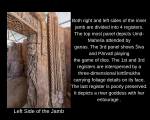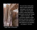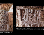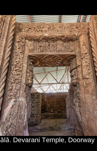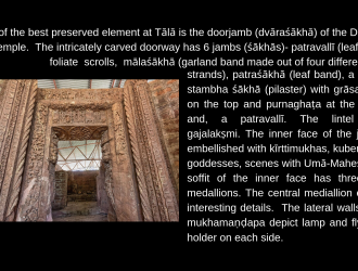 One of the best preserved element at Tālā is the doorjamb (dvāraśākhā) of the Devarani temple. The intricately carved doorway has 6 jambs (śākhās)- patravallī (leaf scroll), foliate scrolls, mālaśākhā (garland band made out of four different floral strands), patraśākhā (leaf band), a circular stambha śākhā (pilaster) with grāsamukha on the top and purnaghaṭa at the bottom and, a patravallī (from inside to outside). The lintel holds gajalakṣmi. The inner face of the jamb is embellished with kīrttimukhas, kubera, river goddesses, scenes with Umā-Maheśa. The soffit of the inner face has three lotus medallions. The central medallion exhibits interesting details. The lateral walls of the mukhamaṇḍapa depict lamp and fly-whisk holder on each side. The style and nuanced ornamentation of the doorjamb indicates a move from the standard 'T-shaped' doorjambs of the Gupta period. It intricate carving on the surface certainly suggests the complexities of the later period, which could have been the result of interaction from the neighbouring regions. The time-period and regions of interaction are, however, not known. This image gallery exhibits a virtual exhibition of the doorjamb of the Devarani temple at Tālā.