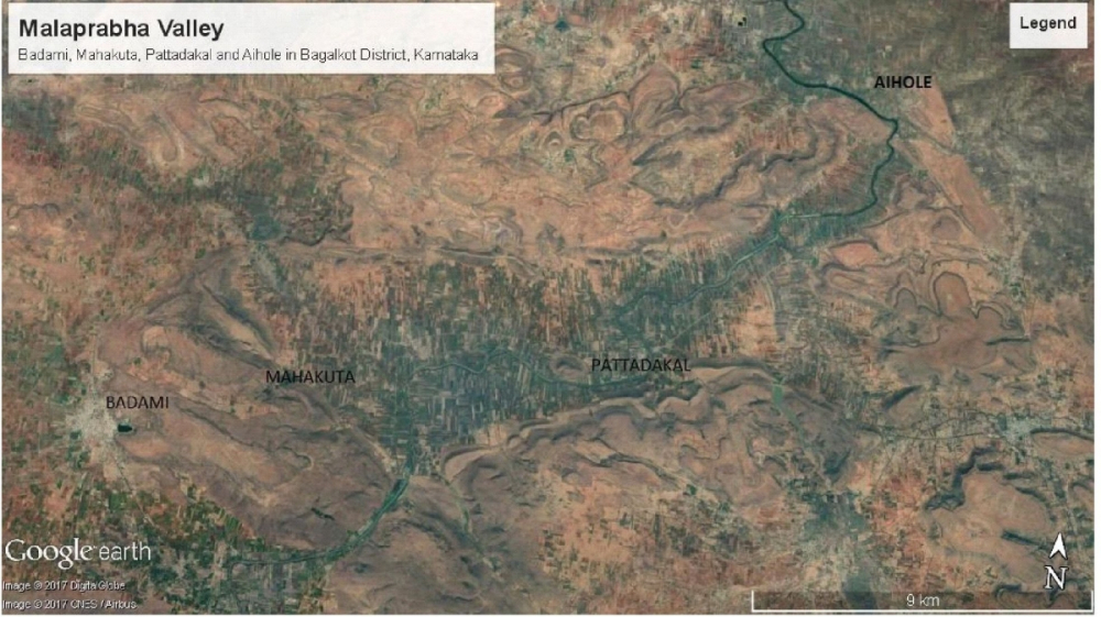 The Early Calukyas, of whom nine rulers held the throne in succession, except for a single 13-year break, all made the Malaprabha river valley their core area. Although under Pulakeshin II, the Early Calukyas extended their rule and dynastic lineage to territories of modern-day Telangana and Andhra Pradesh, in this paper I am focusing only on their sites located in north Karnataka. Their presence in the roughly 25-kilometre stretch of the Malaprabha valley is documented mainly at four well-known sites: Badami, Mahakuta, Pattadakal and Aihole (Figure 1). Badami, or Vātapi as it is called in the earliest stone inscription of theirs, was the capital (Panchamukhi 1986). A visit to Badami’s Calukyan ruins spread between two sandstone cliff formations and separated by an artificial reservoir dating to that period, even today evokes the sense of grandeur and security that was undoubtedly a big factor for this region to be chosen as the capital. Aihole is also an early site of the Calukyas and has some of their earliest religious constructions. Mahakuta is a smaller temple site nestled in a small valley with natural springs and can be reached by foot, crossing eastwards over the low-rising sandstone ridges from Badami. Pattadakal is on the bend of the Malaprabha river as it turns north here. Its complex of temples today portrays the last and grandest phase of Calukya monumental construction activity in a smaller area limited to less than a square kilometer. There are several other smaller sites with Early Calukya remains in between these four but they are beyond the scope of discussion in this paper.[i]