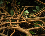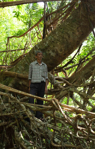 Mr Hally splits his time between working on the bridges and working on his plantation. As a farmer, he grows betel leaves, pepper, areca nut and other crops, which is his only source of income. He said he has been making root bridges since he was a child. It is part of his daily life. He doesn’t see it as a special skill or a task separate from his work on his plantation. Both require knowledge of the environment and its practical application. He does it from his own passion and love, which comes with a certain upbringing and values. For building a root bridge, one must have skills to tie the roots, visualise how they will intertwine and become robust with each passing year. Once strong enough, a root bridge can be used by humans for 300 to 400 years, while also sustaining other life forms within its ecosystem.
