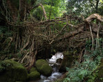 Root bridges are an example of how indigenous knowledge systems evolve to find a solution to problems using locally available resources. No one knows when or how the concept of root bridges started. In the monsoon season, villagers had to cross gushing streams, and given the rapid water flow, it was a dangerous task. It was observed that the Ficus Elastica plant—a species of the fig genus—grew strong roots in the rocky soil which could be manipulated in a certain direction. The elastic roots were stretched to cross streams and, over time, as they grew older and thicker, they could carry the weight of a human. In this way, root bridges became an extended part of a living tree, which make them ‘living’ root bridges. This intangible skill has been passed down through generations within families who have extensive knowledge of the local climate, terrain, flora, fauna and geography.