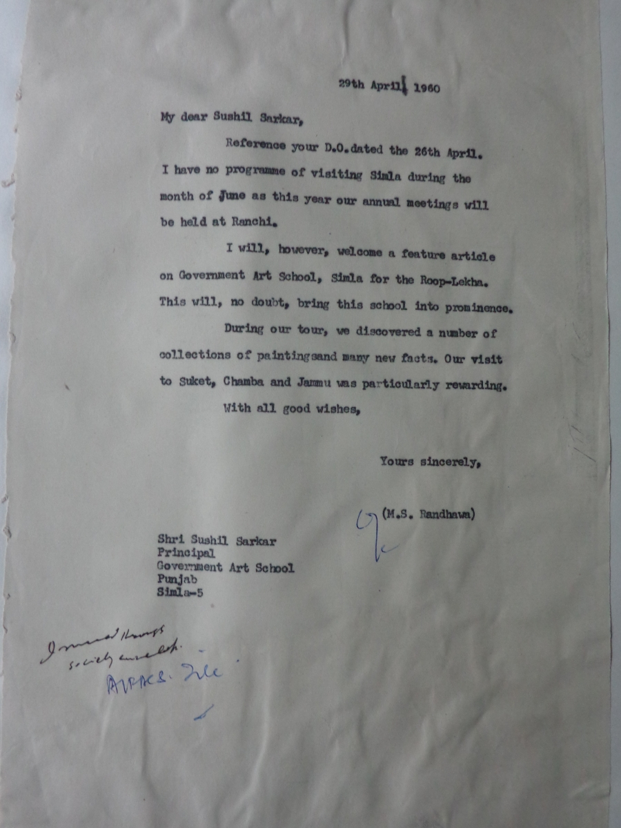 A letter from M.S. Randhawa to Sushil Sarkar, April 29, 1960. Courtesy: M.S. Randhawa Archives in the Library of Government Museum and Art Gallery, Chandigarh.