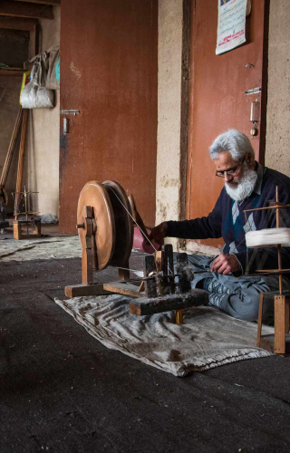 The skill of weaving high-quality pashima shawls has been taught and passed down generations in weaver families who continue to ply the craft even today. Every member of the family has a distinct task assigned. The raw wool is spun into yarn using a spinning wheel. This involves great skill and practice. Then, another round of washing in starch takes place. The natural colour of pashmina wool is white and various shades of brown. If multiple colours are desired, they are dyed accordingly by a rangur (dyer). Next, the weft and warp is prepared for the loom. The yarn is rolled into small bobbins required to make the weft. The warp is made by manually winding the pashmina yarn across four to eight iron rods erected on the ground. Before the warp can be put on the handloom, it has to be dressed by a bharanguror warp-dresser. This process involves stretching and fixing of yarn in the heddles of a saaz (loom). Weaving is done on the large wooden stand locally called thanjoor. The shawl weaver is called wovur and the process is called wonun. While weaving, the thread breaks many times. To join the threads, the weaver rolls the broken ends together and this results in split ends all over the shawl. These protrusions are clipped by a process called purz and the person skilled in this is called a puruzgar. Finally, the edges are finished to make fringes by a process called andkadun and the person who does this is called andgour.