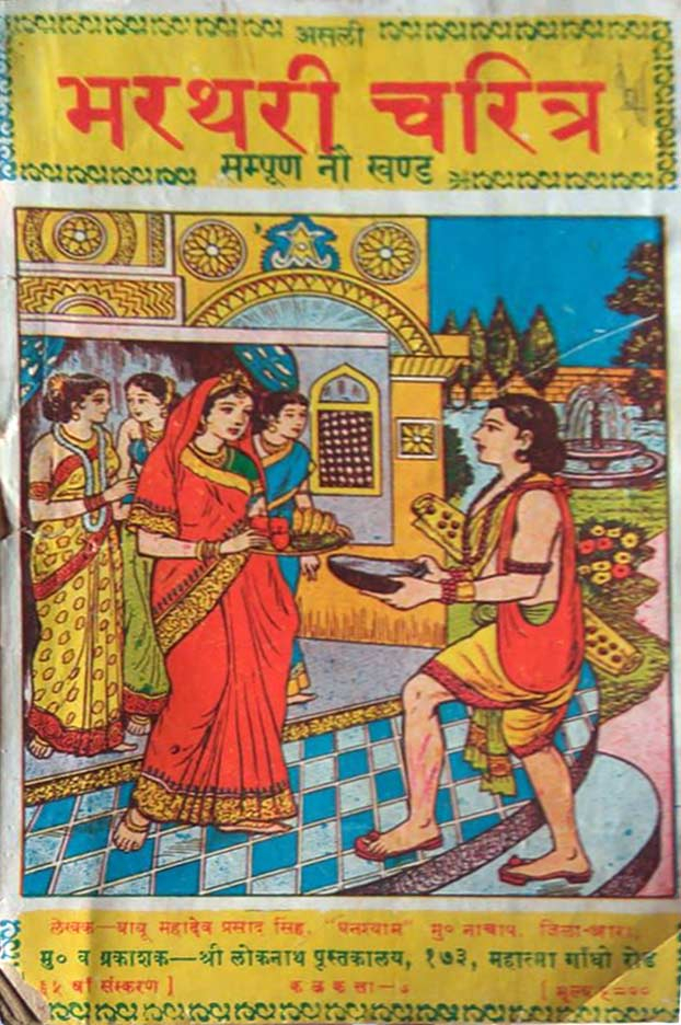 Rekha Jalkshatri’s version of the story of Bharthari begins with the plight of Bharthari’s mother who is distraught at being childless. She finally gives birth to a son through the blessings of a Nath yogi who offers her a fruit with powers to help her conceive. At his birth astrologers were called from Benaras to cast his horoscope. The astrologers predict that the child would renounce the world to become an ascetic after the age of twelve. The mother, dismayed, approaches soothsayers and yogis for a solution that could alter his fate, but to no avail. So she arrives at a solution on her own—to marry him off at a young age to prevent him from renouncing the world. On his wedding night Bharthari goes to his wife seated on a golden cot. When he approaches her, his wife bursts into laughter and breaks the cot. Bharthari is perplexed and humiliated. Why did she laugh so hard on seeing him that she broke the cot? What was the reason for her amusement? She refuses to divulge the cause, answering instead that her sister who lived in Delhi would provide the answer, not she. Bharthari waits for a pretext to travel to Delhi. Finally, his sister-in-law gives birth to a child, and Bharthari is invited to be part of the celebrations. His wife advises him to travel in full princely regalia, for her sister was married to the ruler of Delhi. When he finally meets his sister-in-law, Bharthari asks her why his wife had laughed at him on their wedding night. She defers disclosure, and says she will disclose on her rebirth as a pig, and then as a hen and so on for seven lives as dog, parrot, and other fabulous lives. She finally discloses that his wife was, in fact, his mother in his previous birth; this memory made her break into laughter. The revelation causes Bharthari great consternation.