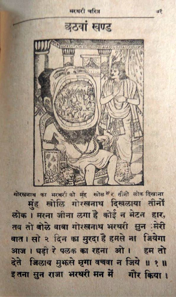 Interwoven into this tale is also a plot that privileges the role of Nath Panthis. The story shifts to the scene of a hunt: Bharthari is off in pursuit of a magical deer. He encounters its spouse who offers her own life and begs him to spare that of her mate. Bharthari, driven by ideals of his caste, refuses and hunts down the deer. A curse is on him now, for this killing. The Nath yogi staves off the curse on Bharthari by restoring the deer to life. Bharthari is moved by a desire to renounce the world and become the disciple of the Nath yogi, Guru Gorakhnath himself. The yogi warns him that the path is not easy—he has to cut off ties with his wife, approach her as a mendicant, call her mother and receive alms. This is not easy. His wife refuses at first but has to give in eventually. Bharthari becomes a Nath yogi.
