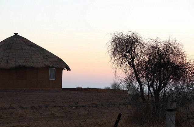 The tangled branches of a kair thicket are outlined against a pale sky lit with dawn colours