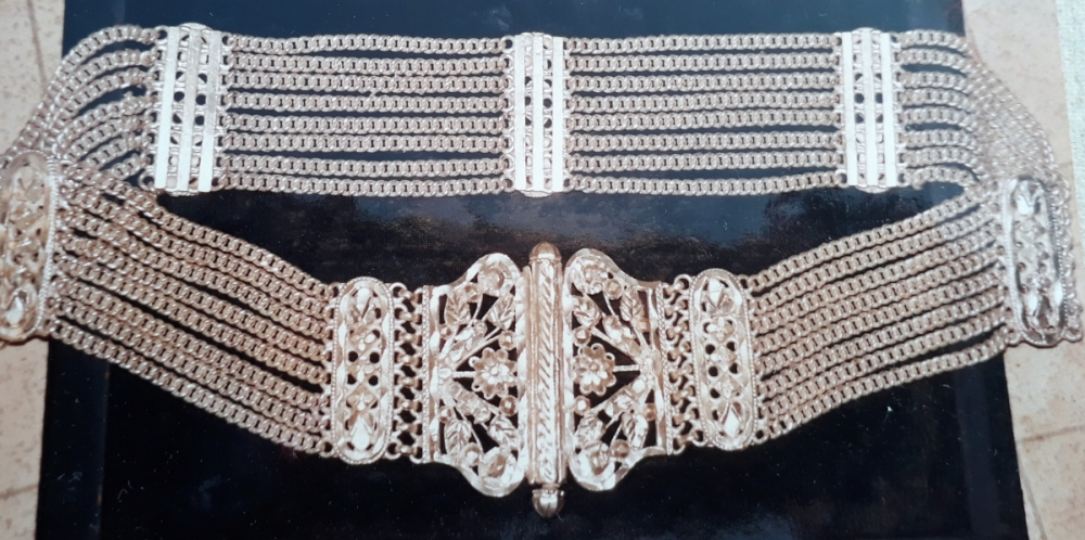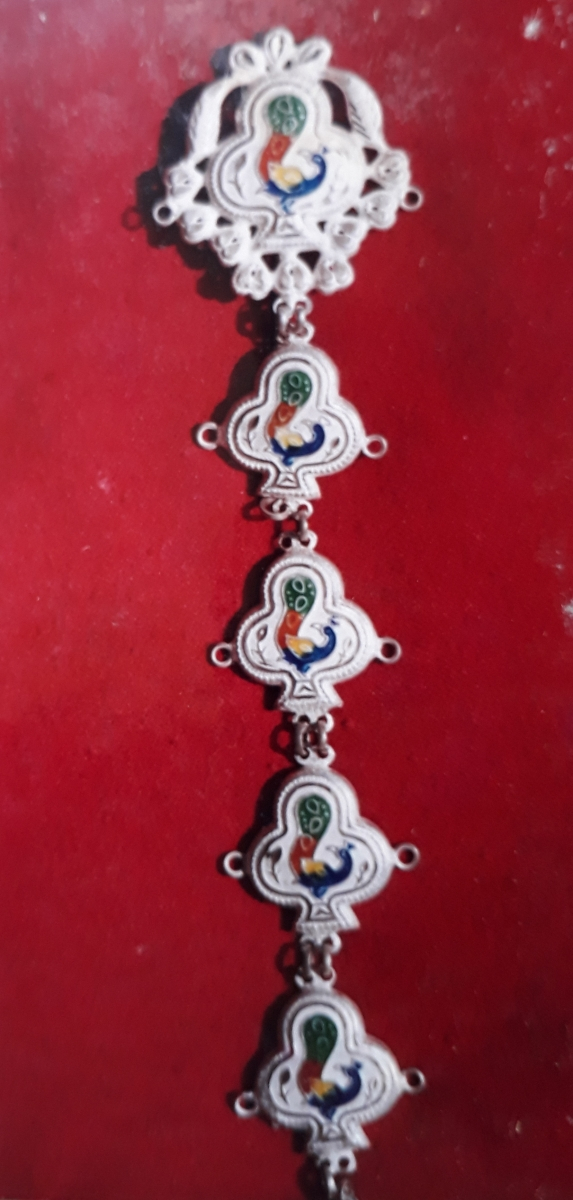 This is a popular traditional ornament for women, worn on the fingers. It is made of wires and covers the whole hand and all five fingers.