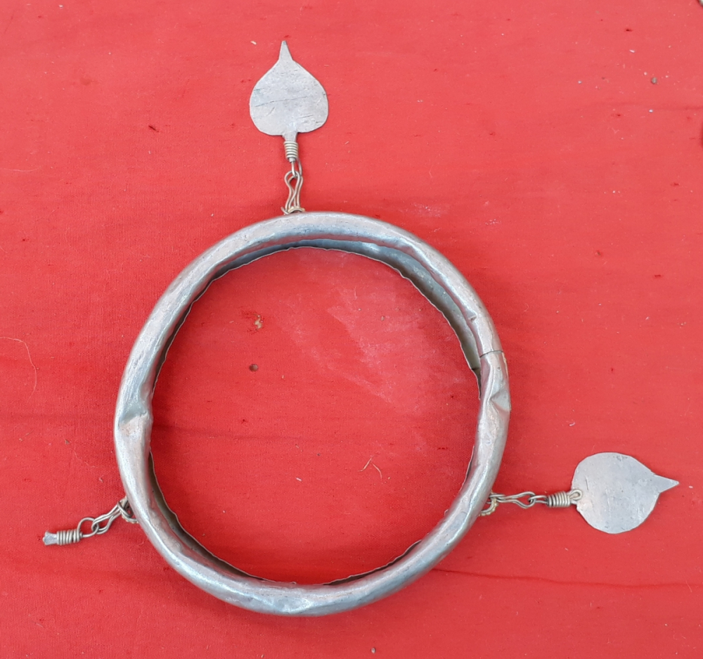 This is a bangle-like ornament, commonly worn on the wrist by married women of rural and tribal communities in Chhattisgarh. It is made of silver, gilat and brass. The size is between 1.5 to 2 inches, and weight varies from 20 gm to 200 gm. It is made from a single sheet and moulded into shape.
