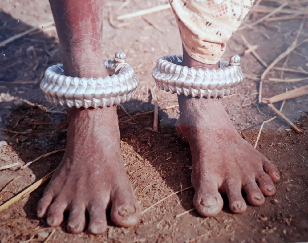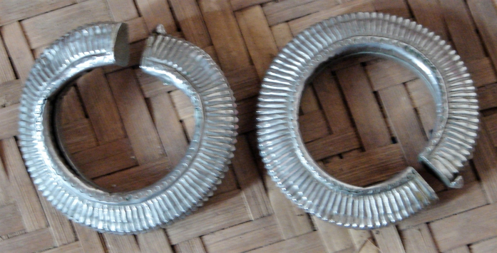 The Kathal is another traditional hollow anklet used by the Agaria and Raut women of the region. It is made of silver, and is only very rarely made of gilat. Weight varies from 160 gm to 1000 gm. It is a hollow pipe with flat spikes, like a jackfruit (kathal), hence the name.