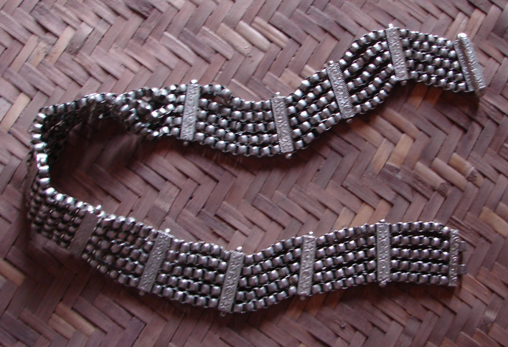 The kardhan is an ornament that is used by women of almost all tribes and castes in Chhattisgarh, but especially by Satnamis. It is a waist belt worn with a clip, which has the purpose of reducing the flabbiness of the stomach of a young mother after delivery. It is worn only by married women, not widows. The kardhan is made in many designs (especially jhalar and chainphas), in silver or gilat, depending on budget. Generally, the size varies from 25 to 38 inches, according to the size of the waist. The weight varies from 200 gm to 2000 gm, depending upon the material and design desired by the client. The kardhan is made by soldering wires (silver or gilat) and with dies and moulds.