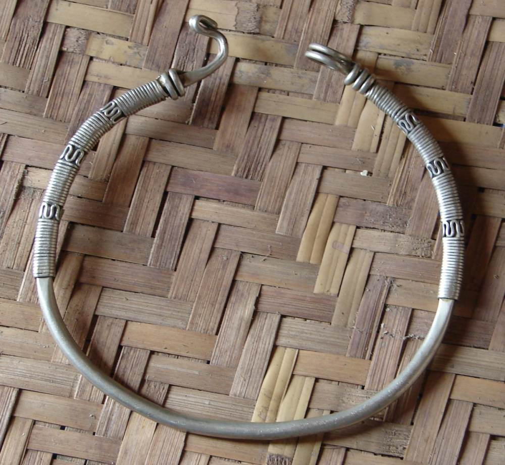 These are traditional neck ornaments used by tribal women. Made of either silver or gilat, they are 20 to 50 tola (a tola is a little over 11 gm) in weight. The husli has a pipe structure.
