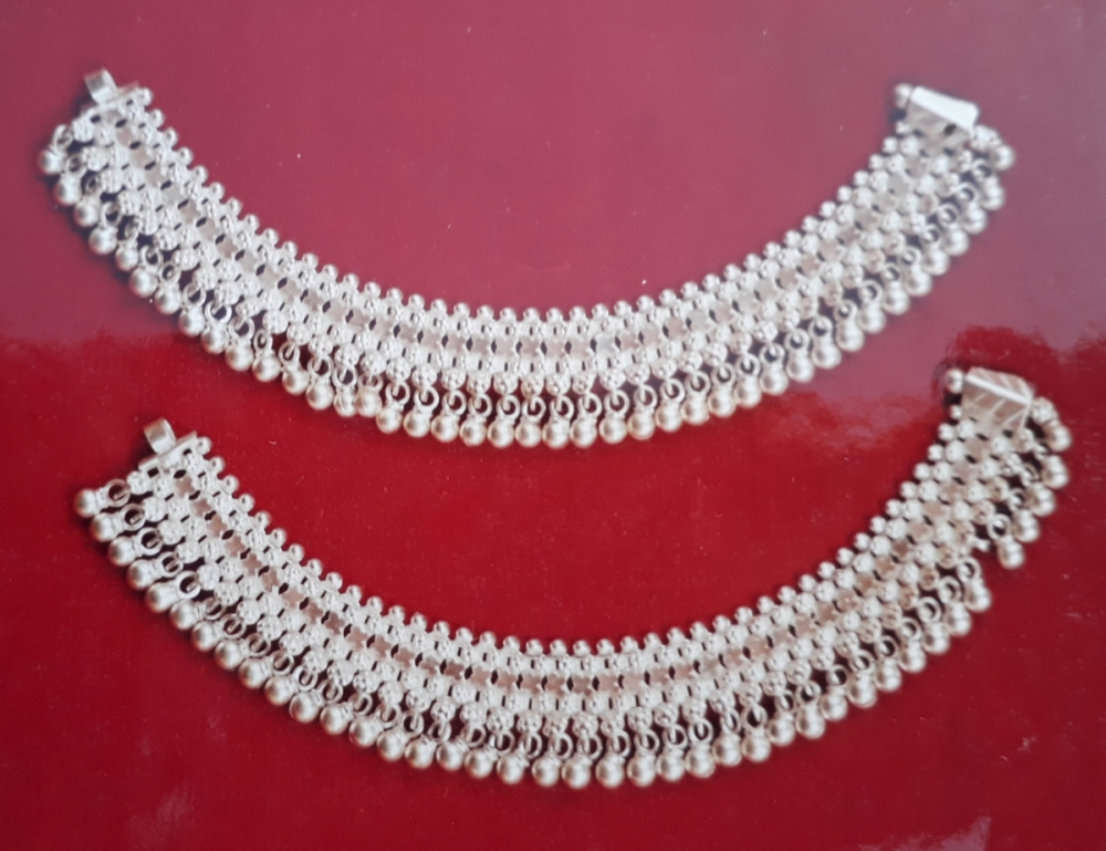 Payal is a modern-day anklet worn by women in the village or city. Available in silver or gilat, the maximum weight of a payal is around 600 gm. It is made with a die.