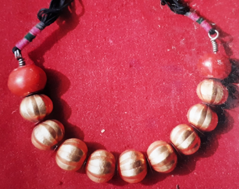 The necklace has become very fashionable among rural communities in recent times. Made of gold or silver, it is worn by higher castes. The weight of a necklace varies from 10 gm to 60 gm, depending on budget. Die and embossing processes are used.