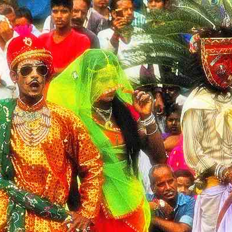 For 40 days in the year, an entire village in Rajasthan’s Mewar region loses itself in the celebrations of the mother goddess, Gavari. We train the spotlight in this unique festival in which all members of the local Bhil tribe come together to perform a mystical dance and music drama like none other. (In pic: Actors dressed as various characters in a play during the Gavari Festival; Photo courtesy: Wikimedia Commons)