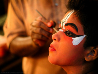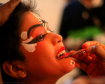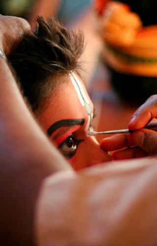 The gallery displays images of the make-up and costume preparations backstage before a Yakshagana performance. Images courtesy of Makkala Mela, Saligrama and Yakshagana artistes.