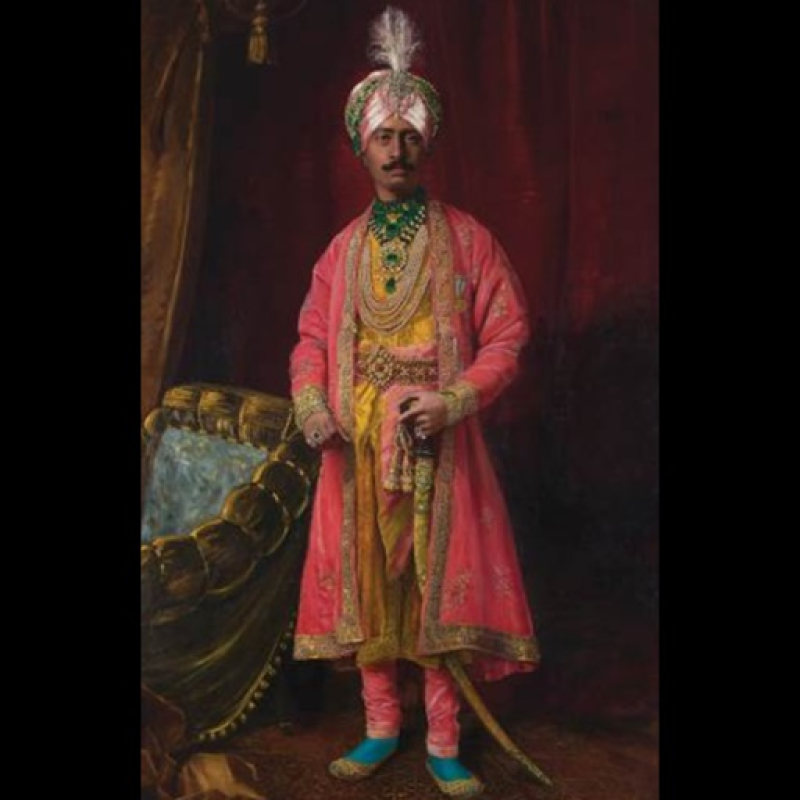 For instance, the striking portrait of Nawab Ahmad Ali Khan of Malerkotla (c. 1930) was painted from a photograph by the renowned Bourne & Shepherd studio. This painted reproduction is curiously signed in the studio’s name instead of the original artist(s). Sized at a massive 108 x 60 inches, with the original frame weighing over 200 kg, this painting is a stunning example of how painters and photography studios worked together. Other examples of this style are the photos of Maharaja Jiwaji Rao Scindia (1916–61) of Gwalior, which appear both as a black-and-white photograph as well as one hand-tinted with watercolours.