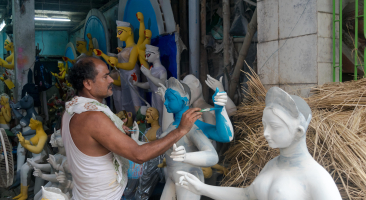 Durga Puja is one of the most-awaited festivals for Bengalis around the world in the autumn month of Ashwin (Bengali calender, corresponding to September–October in the Gregorian calendar). In Kolkata this week-long festival is celebrated with much pomp and grandeur—idols of Goddess Durga and her children, Lakshmi, Saraswati, Kartik and Ganesh, are installed at exquisitely decorated pandals in neighbourhoods around the city, people buy and gift new clothes, queue up to visit the pandals, eat good food and make merry. The festival is also a celebration of craft and tradition, given that a lot of innovation and thought goes into the preparation of the same. Idol-making is one such aspect of the festival, and this module attempts to provide an insight into the goings-on in the narrow alleys of Kumortuli where around 500 kumors or potters are engaged in making clay idols of Goddess Durga.