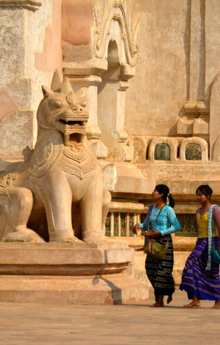 Ananda was originally named Anantapanna, meaning ‘infinite wisdom’. The temple was consecrated in 1090 CE. It is also possible that the shortened name Ananda is a corruption of the Nandamula caves or the historic personality Ananda, one of the principal disciples of Buddha. The influence of Indian ideas is visible in many design elements, from its North Indian style shikhara to the use of Hindu motifs like dwarapalas (gatekeepers), kumbhas (pots), chinthe (lion) and makaras (mythical sea creature). According to French epigraphist George Coedes (considered the father of Southeast Asian archaeology) the architect was buried alive (together with a child) to serve as protective guardian spirits, known as Natin Burma.