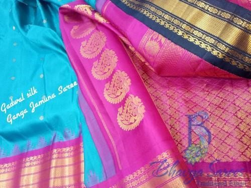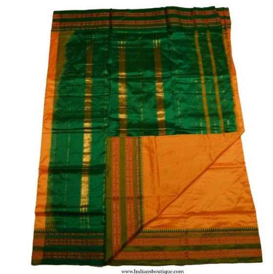 The double-colored Ganga-Jamuna saris are traditional Maharashtra saris. The main characteristic of this sari is the plain weaving with solid colours on either side - both sides of the sari can thus be worn. This sari is woven on double cloth principle with two shades of colour in the warp and weft. (http://www.craftandartisans.com/ganga-jamuna-saris-of-maharashtra.html, n.d.) |