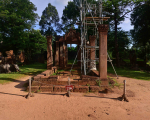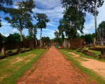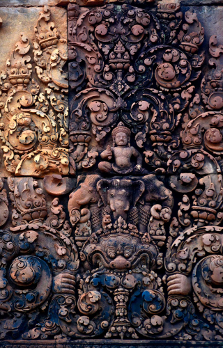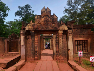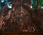 Banteay Srei’s innermost enclosure is surrounded by a moat and has three central shrines; two dedicated to Shiva and one to Vishnu. The temple also has wide representation of beasts, apsaras, devatas, gandharvas, gods and goddesses of the Hindu pantheon. These narratives cover stories from the Mahabharat and the Ramayana, Shaktism and dashavatara (ten avatars of Vishnu). The artwork of Banteay Srei is not just an act of hired craftsmanship. From the density of the carvings, it would seem artists were given license to decorate every available surface in a competitive expression of devotion to Hindu Dharma. As a result, Banteay Srei’s exuberant artwork marks the acme of Hindu temple art, unmatched at Angkor.