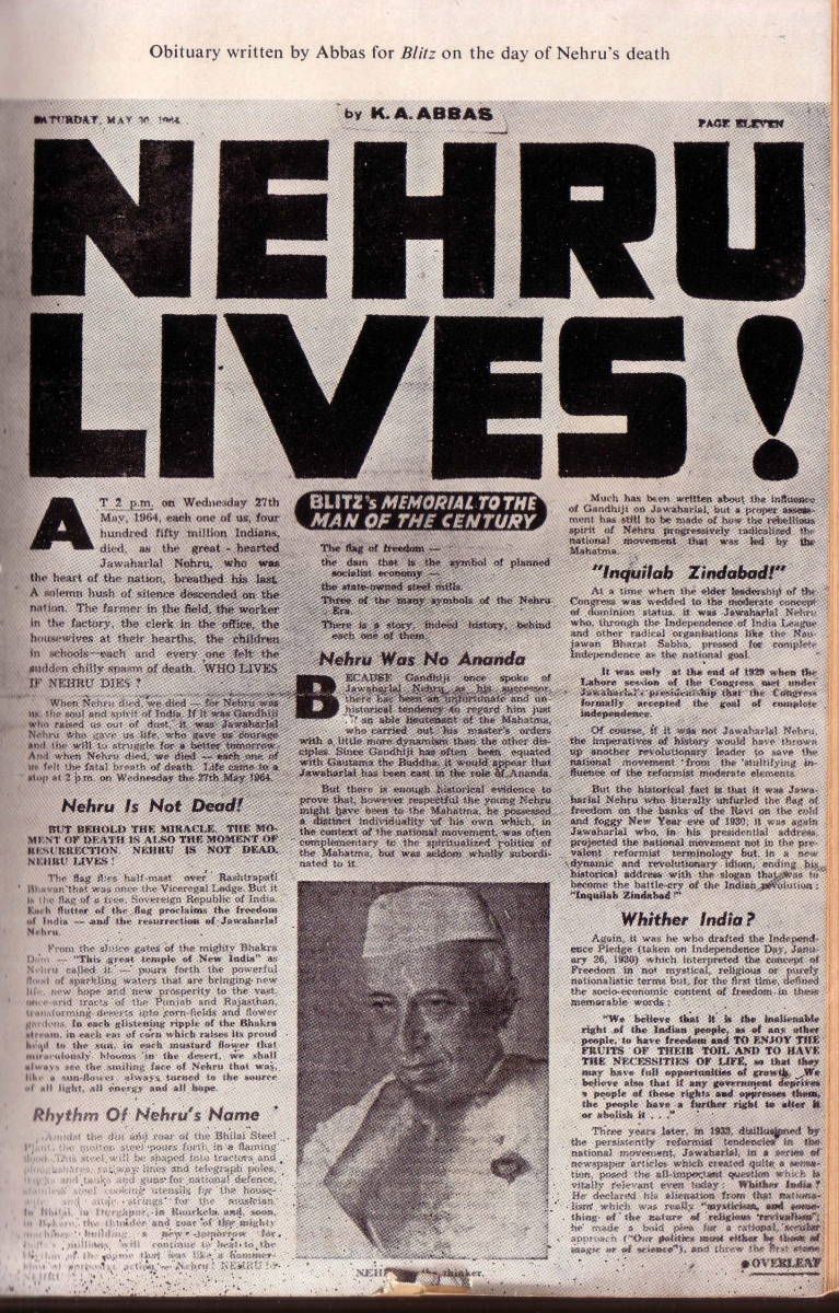 Once he took a taxi from Juhu to Flora Fountain when he was called by R.K. Karanjia to write what was meant to be an obituary for Nehru, who was fighting for his life at Teen Murti House in New Delhi. When Karanjia pressed K.A.A. to give a headline for the obituary, he titled it, ‘Nehru Lives’.