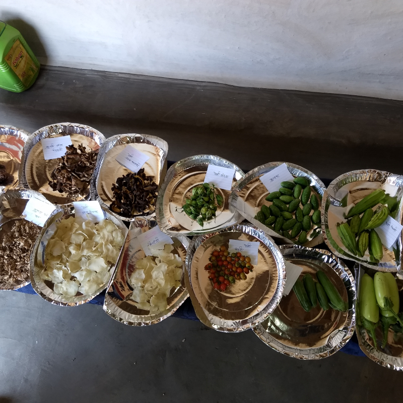कई प्रकार के कांदे (Tubers) जैसे : अरबी (Colocasia esculenta /Colocasia or taro root), निन्नी बिट्टी (Ninni Bitti), सूरन, (Amorphophallus campanulatus /elephant foot yam), मटारू, (Mataru) निरबिस कांदा (Nirbis Kanda) कनिया कांदा, जंगली फल, लौकी (bottle gourd), कद्दू, (Pumpkin) गिलकी, मूली (Radish), सेम ( a species of beans), बरबटी (Vigna unguiculata /cowpea) |