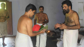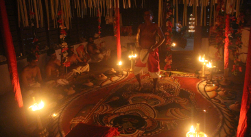 Kalamezhuthu Pattu is a mode of worship and a ritualistic art form unique to Kerala. Also known as kalam pattu or simply, pattu, it involves creating the form of favourite deities on the floor, singing songs in their praise, and finally, erasing the drawings through ritualistic dance steps. Performed at annual festivals and on special occasions, kalamezhuthu pattu is a broad term which encomapasses various types of kalamezhuthu across Kerala, with regional variations and differences in content, execution, scale, duration, and purpose of the performances. The most common deities are Bhadrakali, Vettakkorumakan, Ayyappan, and serpent gods. Because of the image and the mythology associated with the deity, kalamezhuthu pattu dedicated to Lord Vettakkorumakan is unique and is considered a classic example of kalamezhuthu of Kerala.