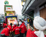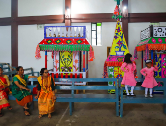 Behdeinkhlam is derived from two Pnar words: Behdein meaning ‘to drive away’ and Khlam meaning ‘plague’. Thus, Behdienkhlam has its origins in the mists of time when an epidemic of cholera spread across the Jaintia hills. To stop the plague, four sisters carried the longest tree trunk from the forest and buried the evil plague in a pool of mud. These four sisters, named Ka Doh, Ka Bon, Ka Wet and Ka Tein, are believed to be the matrilineal ancestors of Jowai’s present-day population of Jaintias. Each locality prepares a decorative tower-like structure called a ‘rath’. These are carried in a procession to an artificial mud-pool (aitnar) for symbolic immersion. While the men perform the sacrifices and outdoor rituals, the women prepare offerings for their clan ancestors and pray to U Blai (supreme deity) to protect themselves and mother nature from evil spirits, plague and disease.