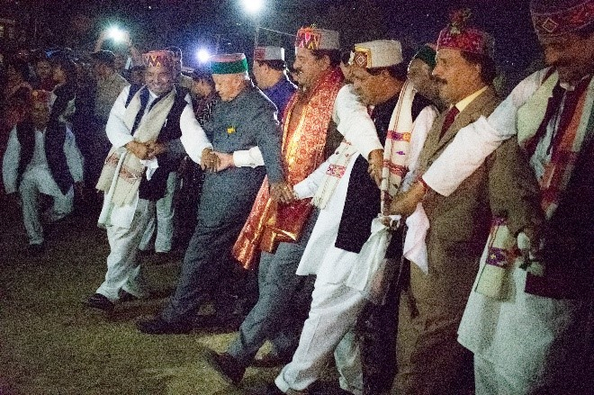 Fig. 5: Virbhadra Singh, former chief minister of Himachal Pradesh, dancing along with members of the community