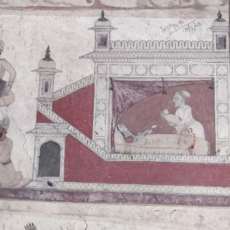 Laharu’s work focuses on the male and female physiognomy and shows utter disregard for the background, which always has a stage set-like appearance. Two of his famous works are the Bhagawata Purana set painted in 1758 for Mian Samsher Singh (the younger brother and Wazir of Umed Singh) and the murals at the Devi Kothi temple. In the Devi Kothi murals, for example, Laharu emphasised on the outer architecture of the buildings even though the stories unfold in the inner chambers. He systematically arranged around the narrative elements such as erect minarets of marble, grids of red bricks and angular pillars. The architectural bodies are proportional to each other, even if they are not so with the human figures they enclose. (Fig. 1) The perpendicular appearance of the buildings enhances their monumental charm, which is evident in the houses and palaces that Laharu painted.