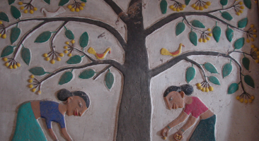 The soil of Sarguja is rich, loamy and varied. Deep black, ochre and white, their colour and texture lends itself to possibilities of being moulded by hand. The Rajwars, traditionally landowning farmer communities, have long held a special affinity with this clay, beyond the needs of occupation or even ritual. After their homes were built by men, Rajwar women plastered the walls of their homes with clay (lepai) embellishing them afresh every year after the rains. This process has nurtured their creativity, for clay embellishment has a special role in their lives and homes. After this form received recognition through the work of Sona bai Rajwar and others, it was seen to have a market potential, mostly as a craft that could help people from this region earn livelihoods. Training centers were set up, resulting in a spillage of its practice. Large- scale commissions for murals mostly in urban environments became its chief marketability. In this, aesthetic sensibilities were transformed, and the popular and kitsch entered its vocabulary.