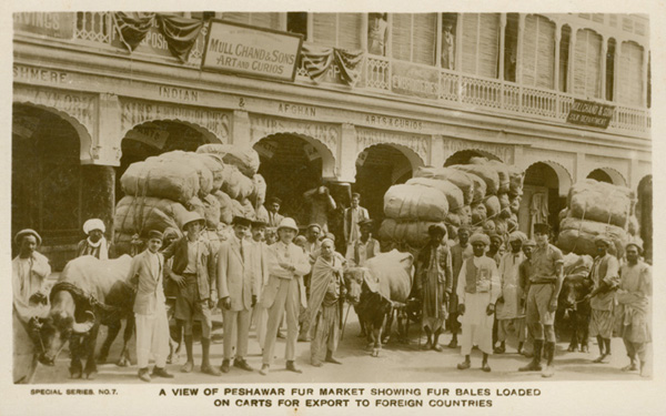 A group of British colonials and ‘natives’ pose for this photo, showing carts loaded with fur for export from Peshawar to other countries. Blending into the background and barely noticed, somewhat like the Sindhis in global trade, the board of merchants Mull Chand & Sons, Art and Curios, can be seen. Source: Collection of Omar Khan, harappa.com. Downloaded from http://www.gutenberg-e.org/hanifi/images/fullsize/peshawar-market.jpg on November 27, 2016