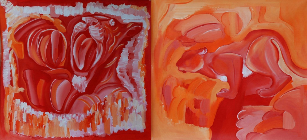 ‘Kandinsky’ (Fig. 10) is both Natesh's tribute to Kandinsky and an indication of his internalisation of the Russian artist's spirit. Divided into two panels, a squirrel in the right panel of ‘Kandinsky’ watches a roaring tiger in the left. Defying representation, the panels constitute a narrative moment one artist looking at the genius of a master. It brings into focus the disinterested contemplation on Kandinsky's lasting influence and spiritual journey. Although sceptical about narration, Natesh favours an abstract narration which resists formalism of any school. Natesh would argue for keeping a point of reference to understand natural evolution. He observes in his notebooks, ‘There are no roots. If you go in search of roots, you will see bloodshed, conspiracies and war. In the area of nature, ice ages, earthquakes, colliding meteors, disappearing landscapes into the seas and deserts spreading their heat on forests, converting them into oases and the extinction and metamorphosis of life. Kandinsky offers a way of perceiving the workings of nature.’ In ‘Kandinsky’, a squirrel watching a roaring and dying (?) tiger is akin to Natesh observing Kandinsky.